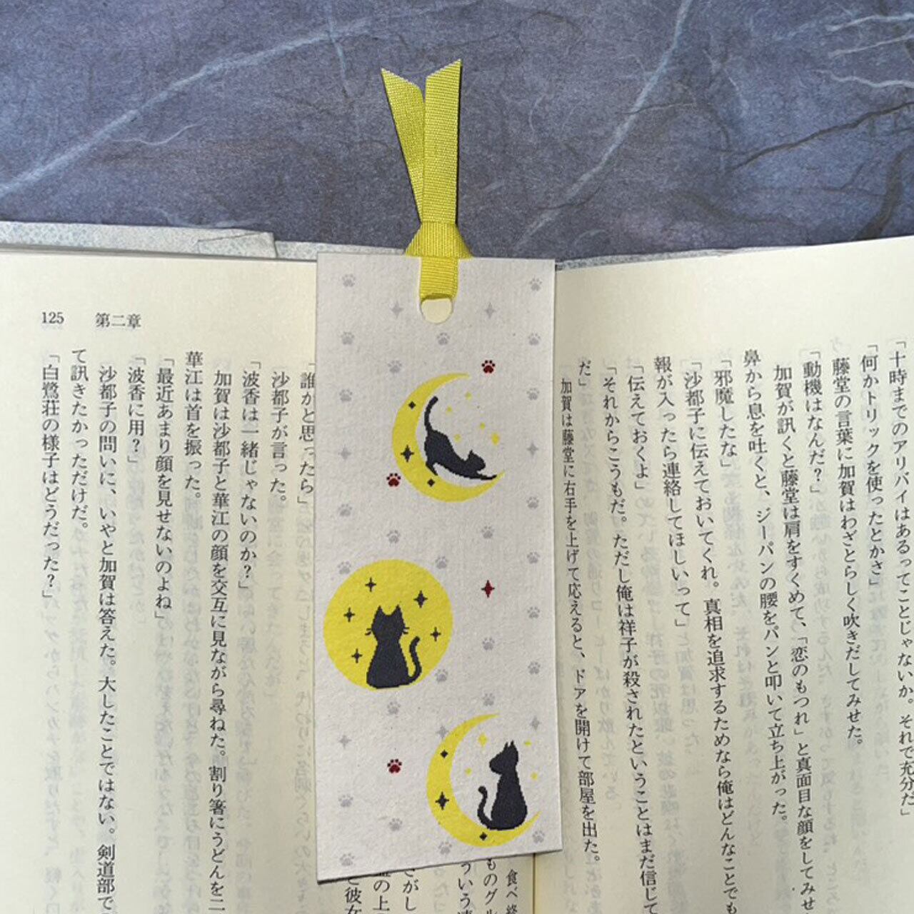 優雅な月猫と美しい夜空の足跡が描かれたこのしおりは、読書を詩的に彩り心を豊かにしてくれます。