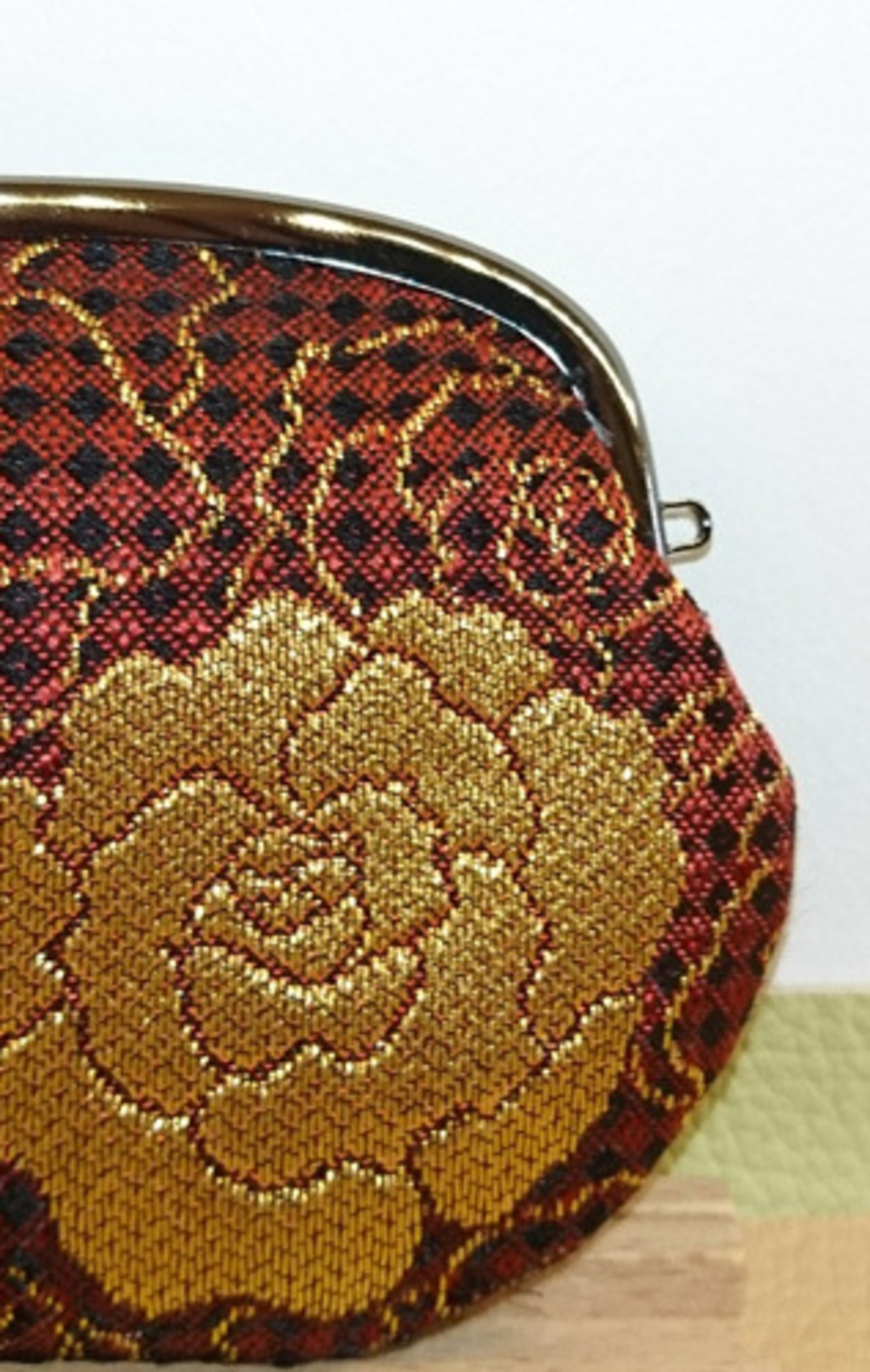 がま口用にバラと蝶をデザインし、5枚目の写真のような袋帯を織っている織職人が、袋帯と同じ縦糸・横糸を使い織った商品です。
