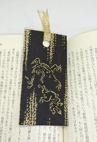 しおり用に鳥獣戯画をデザインし、5枚目の写真のような袋帯を織っている織職人が、袋帯と同じ縦糸・横糸を使い織った商品です。