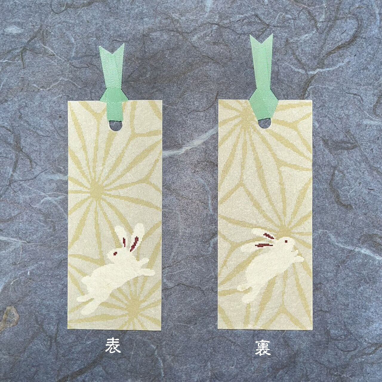 兎と麻の葉文様を手漉き和紙に印刷したしおりです。